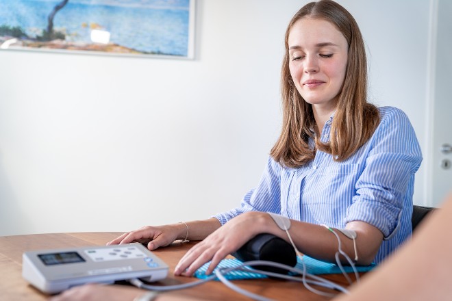Es werden zwei Oberflächen-Elektroden auf die Haut über dem Muskel und eine dritte Elektrode außerhalb des Zielmuskels angebracht. Die Therapie arbeitet nach dem Prinzip der EMG-gesteuerten Elektrostimulation in drei Phasen.