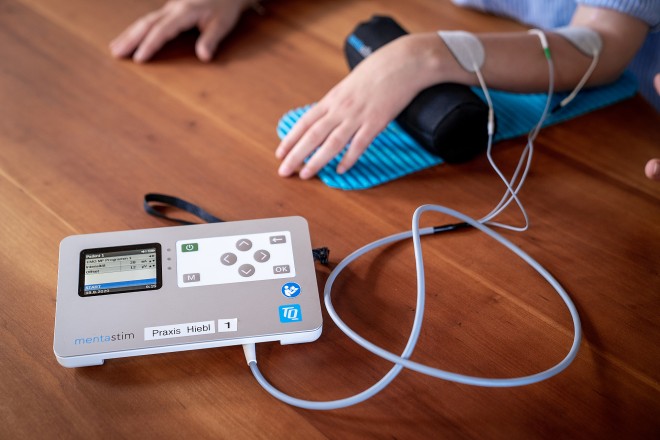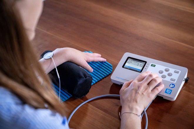 mentastim ist ein Therapiegerät, das für das Wiedererlernen von motorischen Bewegungsabläufen nach Schädigungen des zentralen Nervensystems entwickelt wurde.