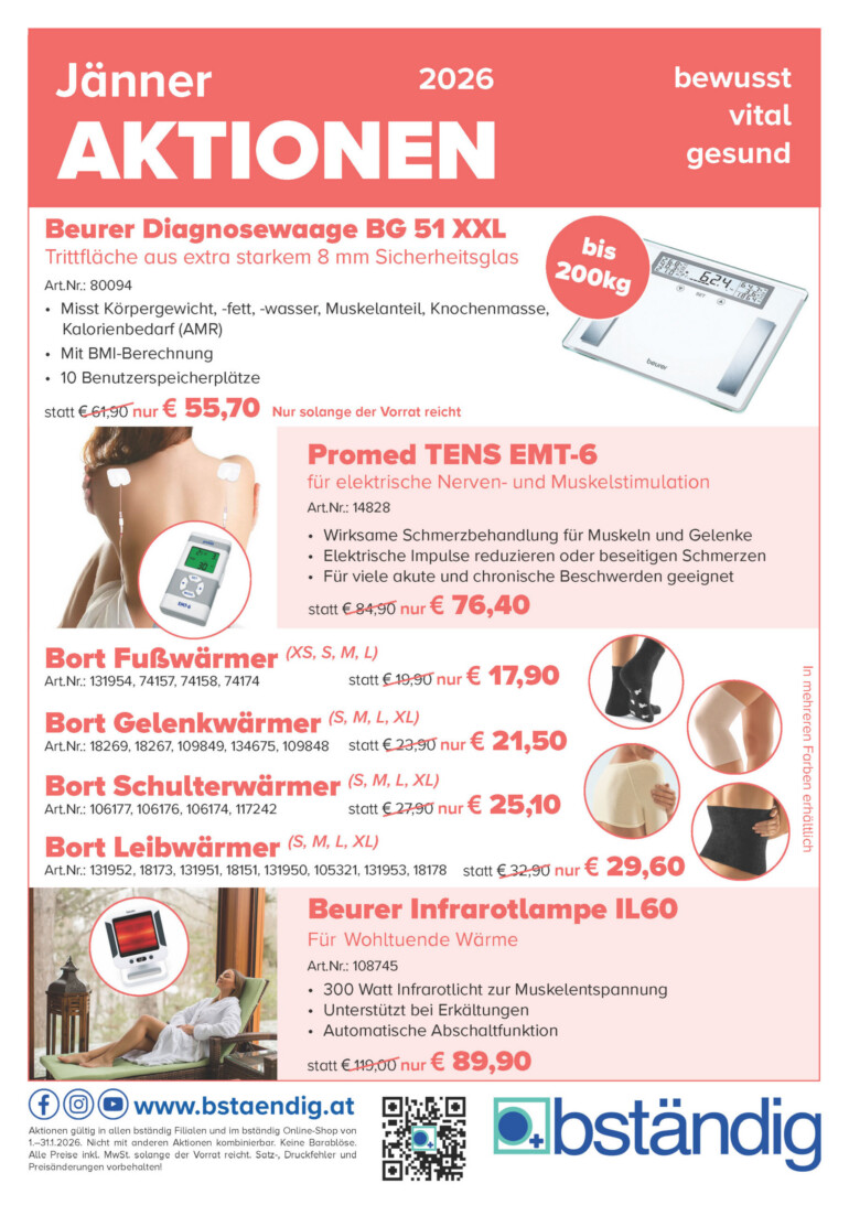 Unsere Monatsaktionen sind in all unseren Filialen, wie auch in unserem Online-Shop gültig. Die Aktionen sind nicht mit anderen Aktionen kombinierbar und sie sind auch nicht gültig auf Produkte, die über Verordnungsschein bezogen werden.